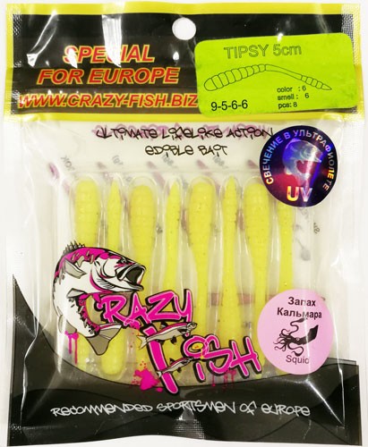 CRAZY FISH TIPSY изготавливается компанией производителем из высококачественного съедобного силикона. Слаг имеет не симметричное тело, уменьшается к задней части приманки, напоминая по форме малька и благодаря этому обладает своей достаточно активной игрой для данного вида силиконовой приманки.
