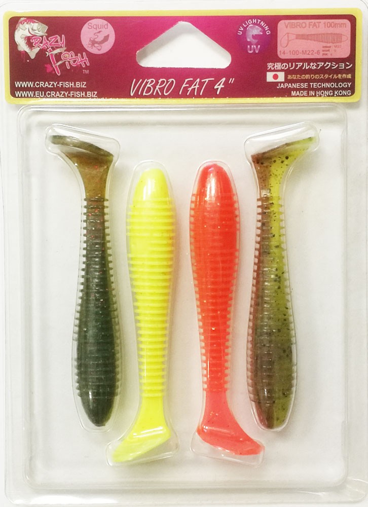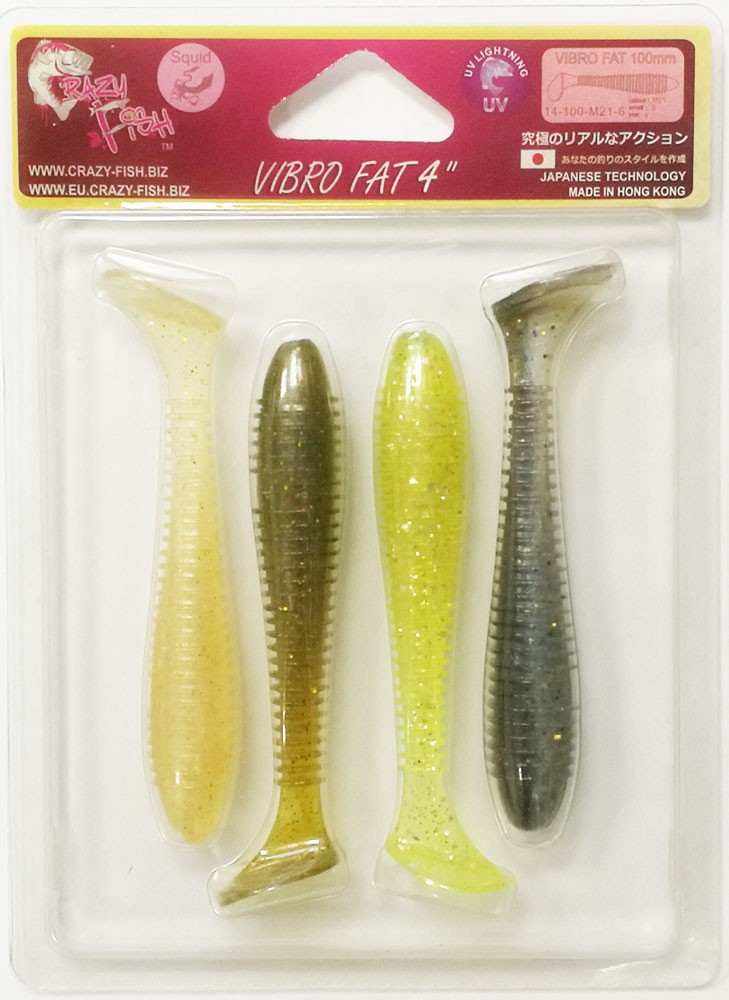 CRAZY FISH VIBRO FAT изготавливается компанией производителем из высококачественного, «съедобного» силикона. Имеет утолщенное тело и гибкий подвижный хвостик, за счет этого обладает очень яркой и подвижной игрой, особенно на падении, что провоцирует рыбу на атаку.