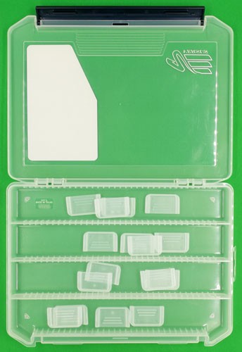 Коробка для спиннинговых приманок и различных рыболовных аксессуаров. Внутри коробка разделена на 4 продольных отделения, которые можно разделить на 20 ячеек с помощью съемных перегородок. Удобная защелка, можно легко открыть и закрыть даже одной рукой. Изготовлена из ударопрочного пластика. Для дополнительной защиты от ударов петли спрятаны под специальный козырек.